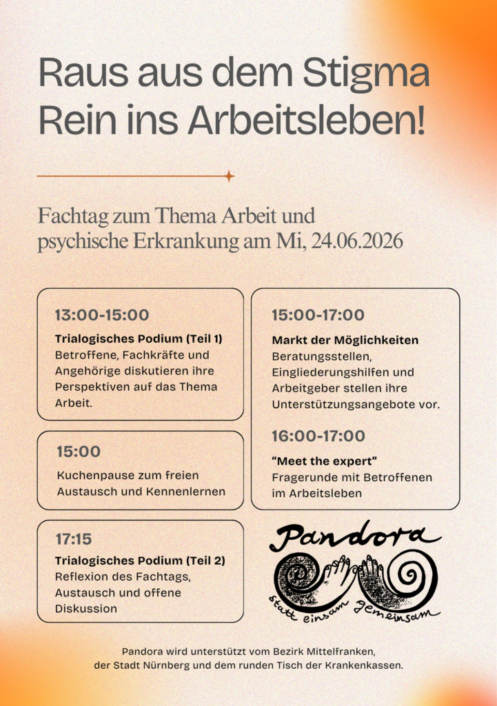 Dieses Jahr veranstaltet Pandora Selbsthilfe Psychiatrie-Erfahrener e.V. erneut einen Fachtag. Am 24.06.2026 laden wir Betroffene, Fachkräfte, Angehörige sowie alle Interessierten herzlich dazu ein, über Arbeit trotz und mit psychischer Erkrankung zu diskutieren und miteinander in einen offenen, wertschätzenden Austausch zu kommen. Ziel ist es, unterschiedliche Perspektiven zusammenzubringen und gemeinsam neue Impulse für mehr Teilhabe am Arbeitsleben zu setzen.